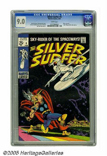 <B>The Silver Surfer #4 (Marvel, 1969) CGC VF/NM 9.0 White pages.</B></I> Overstreet says this issue experienced lower distribution than the rest of the series. Content-wise, this one has plenty to offer, with Thor battling the Silver Surfer, and cameos by the Hulk, the Thing, and Hercules. The cover and interior art are by John Buscema. The Watcher backup feature retells a memorable story from the Atlas days called "The Terror of Tim Boo Ba." This reworked version is drawn by Howard Purcell. Overstreet 2005 VF/NM 9.0 value = $443; NM- 9.2 value = $600. CGC census 5/05: 64 in 9.0, 108 higher.