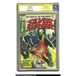 The Silver Surfer #5 Stan Lee File Copy (Marvel, 1969) CGC VF+ 8.5 Cream to off-white pages. Signature Series. This issue vividly displays a great Silver Surfer action cover. Stan Lee has signed this early Surfer issue directly across the bottom of the front cover. Overstreet 2002 VF 8.0 value = $70. Important notice: We expect to be auctioning lots at the rate of 200-250 per hour. Sometimes eBay Premier live bid software cannot keep up with that pace, so we strongly recommend that you place a realistic proxy bid now as insurance to avoid disappointment. Also please note that all Heritage/CAA lots purchased through eBay Premier carry a 20% Buyer's Premium. Please make sure you read the Terms and Conditions.