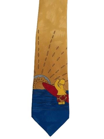This 100% polyester 54 inch neck tie is the perfect thing to "tie" any Simpson's fan outfit together. The tie comes in a soft golden yellow polyester, and features a scene of Homer at the beach with a Surfboard during sunset.