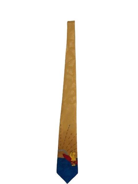 This 100% polyester 54 inch neck tie is the perfect thing to "tie" any Simpson's fan outfit together. The tie comes in a soft golden yellow polyester, and features a scene of Homer at the beach with a Surfboard during sunset.