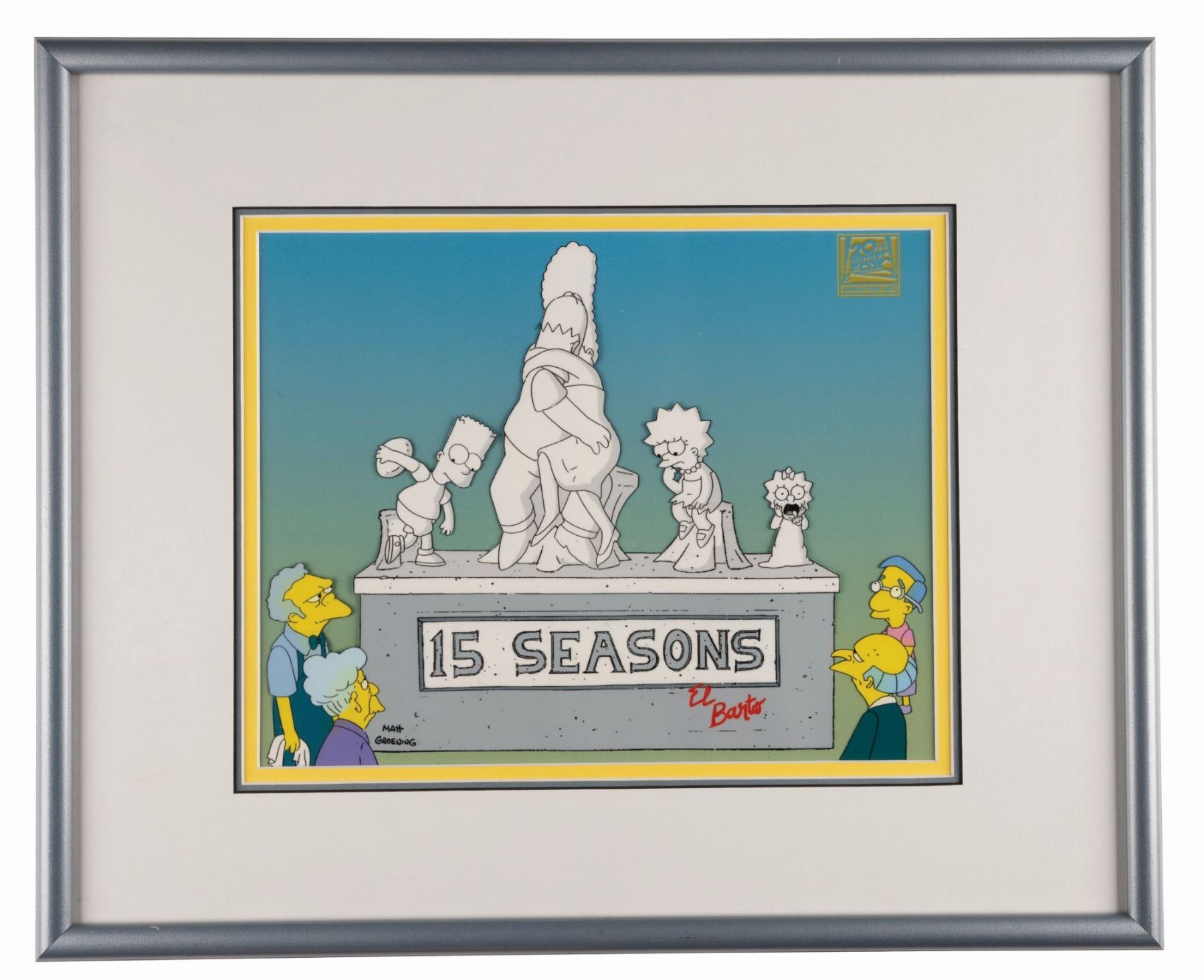 (Fox, 2003) A limited edition hand-painted cel on a printed background commemorating the 15th season of The Simpsons. The Simpsons are enshrined in a marble monument that parodies iconic classical sculpture as the additional characters Moe Szyslak, Agnes Skinner, Millhouse Van Houten, and Mr. Burns look on. The cel was created in an edition of 300 and gifted to friends and supporters of the show. It retains a Fox seal at the top right and a COA on the reverse of the frame. Measuring 9.25" x 11.75" visible in an 18" x 20.5" frame, the cel is in very good condition with minimal wear.