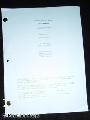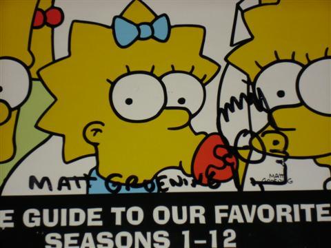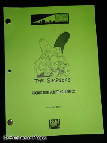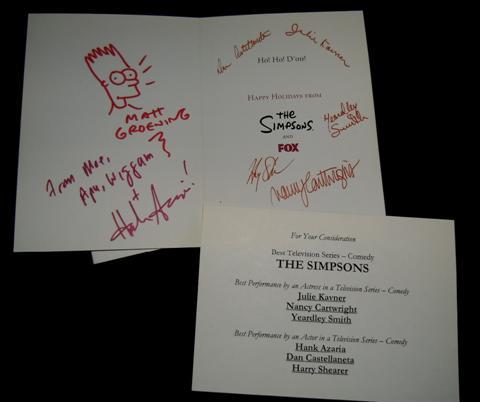 The Simpsons Autographed Collection - A promotional Christmas card sent out to Emmy Voters, asking for them to consider voting for the award winning series, The Simpsons. Autographed by the cast of The Simpsons on the inside of the card -- Dan Castellaneta (Homer), Julie Kavner (Marge), Nancy Cartwright (Bart), Yeardley Smith (Lisa), Harry Shearer (Ned Flanders) and Hank Azaria (Chief Wiggum). Also signed by series creator Matt Groening who drew a sketch of Bart. Very tough to get the entire cast to sign something! A Simpsons Story Board Book for episode 2F19 called “The PTA Disbands”. An early episode from 1994, these books are created by the director and his staff and then sent to the Animators to create the animation for the show. Two original scripts from the series, one called “Special Edna” from 2002 and the other called “in Marge we Trust” from 1996. The Ultimate in a Big Ol’ Box Guide to the Simpsons from seasons 1-12 (Three Books!) which has been autographed on the box by series creator Matt Groening, who also drew a sketch of Bart on the cover.