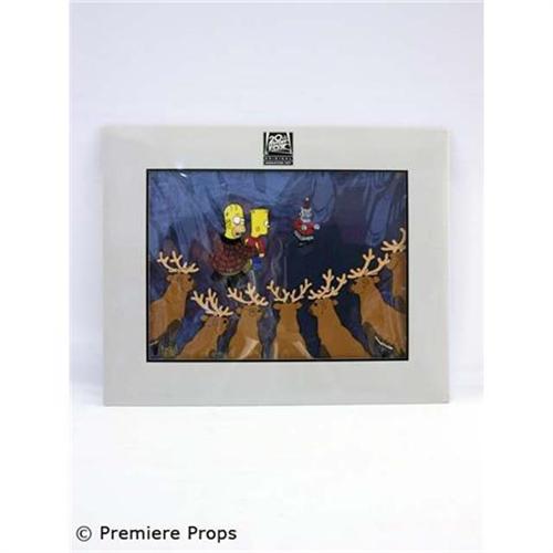 "The Simpsons" original and one of a kind hand-painted cel set up used for production. Homer holding Bart with a toy Santa and Reindeer. Homer's phobia. Comes with certificate of authenticity. (approx. 15" x 12") (ACMA2056)