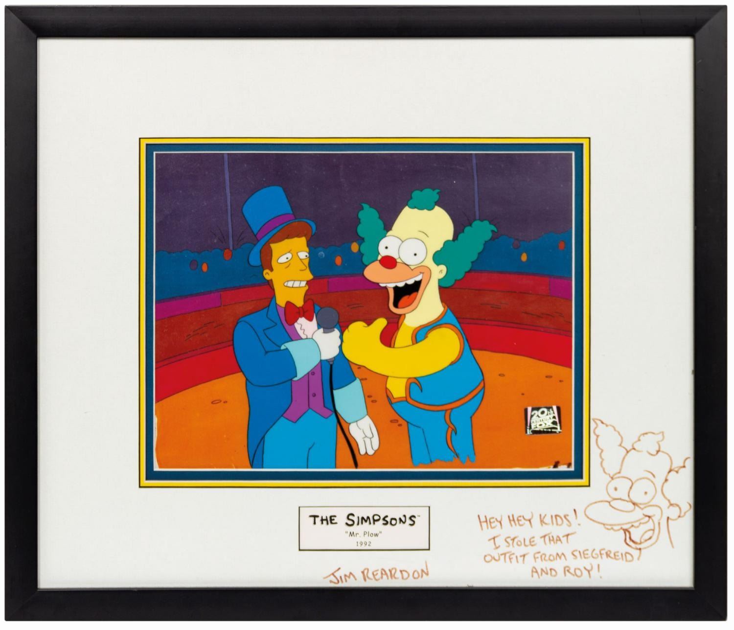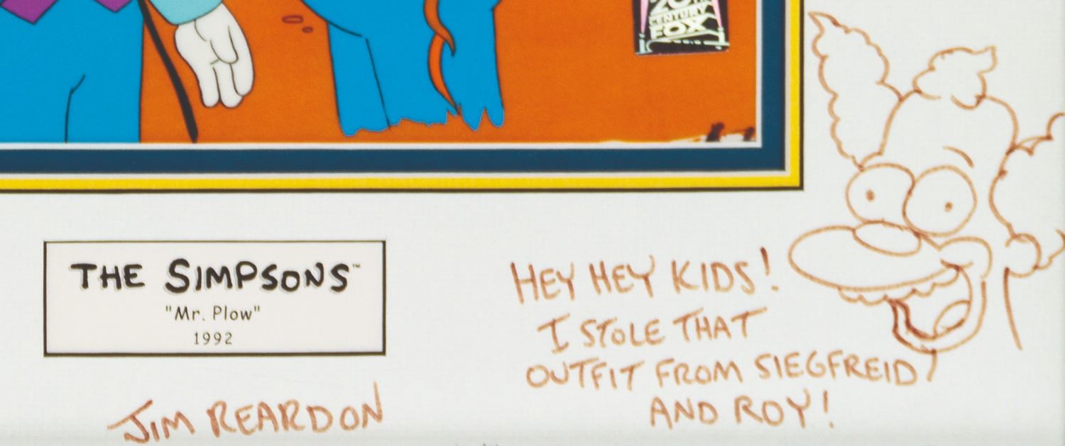 (Fox, 1992) An original The Simpsons production cel from the personal collection of the voice of Bart, Nancy Cartwright. The cel was used in the 9th episode of the show's 4th season, "Mr. Plow." Consisting of two cel layers, one depicting Troy McClure and the other Krusty the Clown, the cel is displayed over a screen-matching printed background. It retains a Fox seal at lower right. The mat has been signed by the episode's director, Jim Reardon, and humorously remarqued with a drawing of Krusty the Clown saying, "Hey Hey Kids! I stole that outfit from Siegfried and Roy!" Measuring 8.75"x11.5" visible through a 17"x20" frame, the cels are in fine condition with minimal production wear.