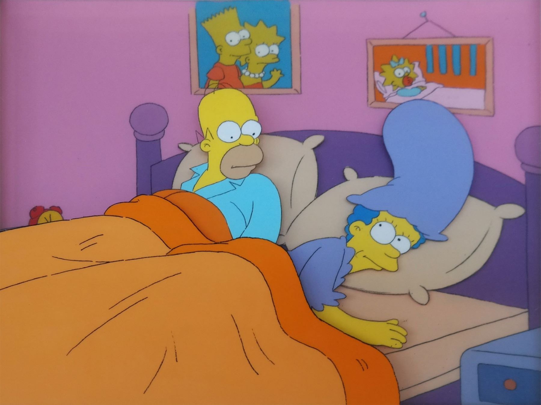 (Fox, 1990) An original multi-cel setup from the first season of "The Simpsons". The cels feature Homer and Marge from the episode "Life on the Fast Lane", and come with the original hand-painted matching background. Together, the cels and background depict the entire family and the cels have an image size of 8.75"x10.5" within the 15.5"x17.5" frame. The condition is very fine with expected minor wear to the frame from previous display.