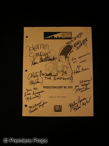 The Simpsons “Trash of the Titans” Autographed Script - Single handily the hardest cast in Hollywood to get autographs from, this script is signed by the entire voice cast of the show! The signatures are Dan Castellaneta (Homer Simpson, who also added Homers signature), Julie Kavner (Marge Simpson, who also signed M. Simpson), Nancy Cartwright (Bart Simpson, who also added Bart’s unique autograph), Yeadley Smith (Lisa Simpson, who also signed Lisa’s name), Hank Azaria (Many voices, including Apu, who’d name he added), Harry Shearer (Many voices, including C. Montgomery Burns, whose name he also signed), Pamela Hayden (Barts friend Millhouse), Marcia Wallace (Mrs. Krabappel, Barts teacher) and Russi Taylor (Marin Prince). That’s the entire nine voice actors on the show. The script is the record version of the script, so it may have differences from what original aired! This episode guest starred Steve Martin and U2… the one where Homer runs for trash commissioner!