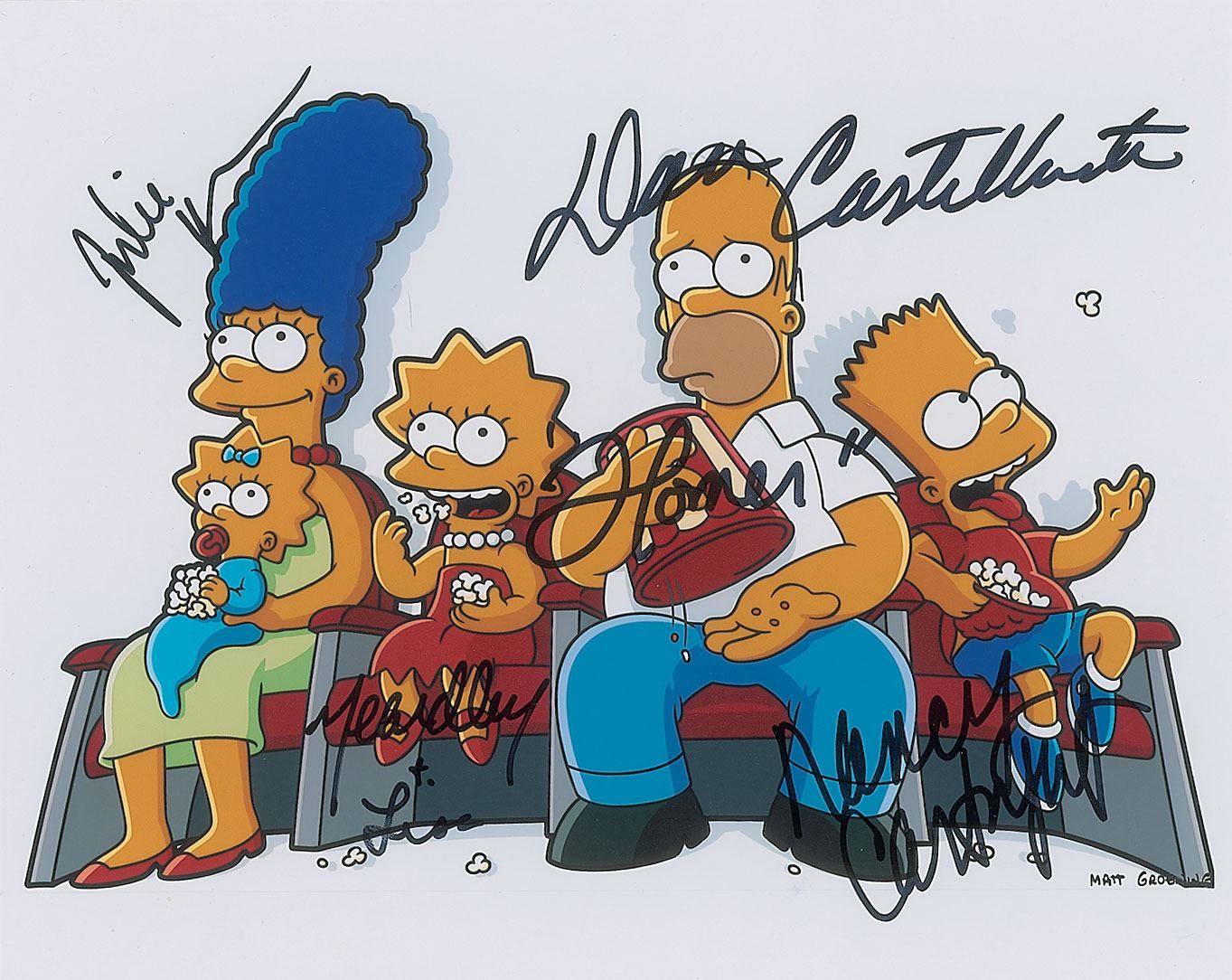 Great color satin-finish 10 x 8 photo of the Simpson family, signed in black felt tip by voice actors Dan Castellaneta, Julie Kavner, Nancy Cartwright, and Yeardley Smith. In very fine condition.