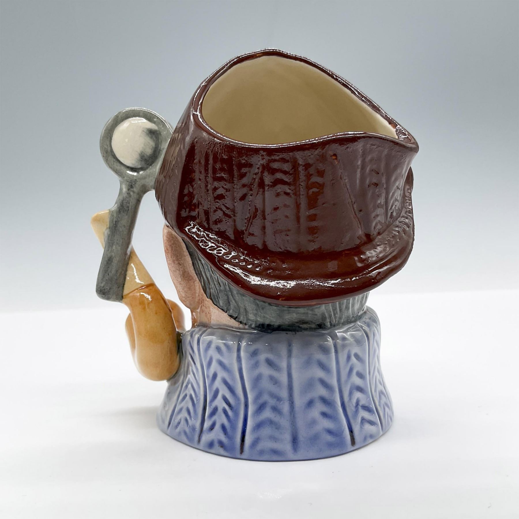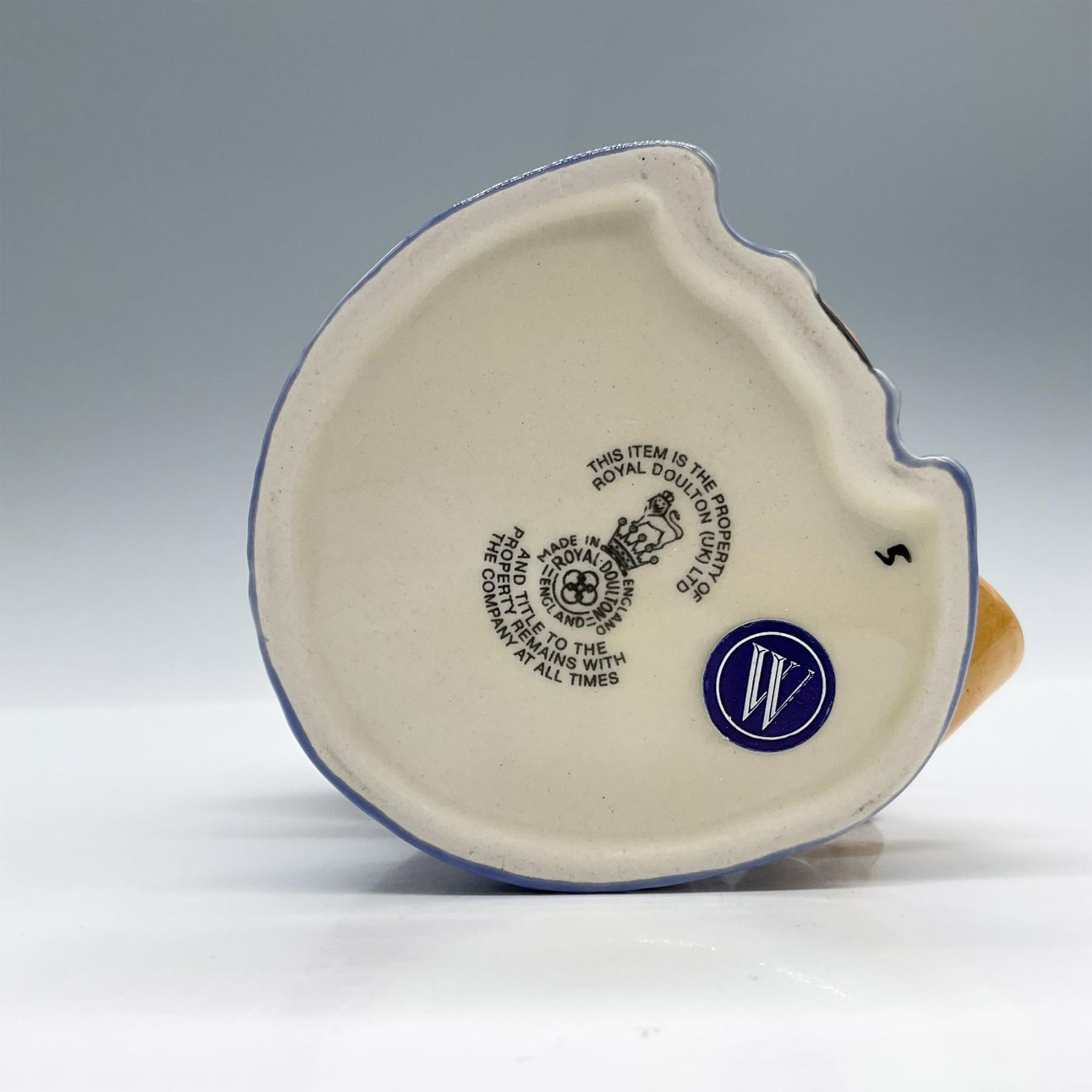 Small character jug of Sherlock Holmes in a blue cloak, brown deerstalker hat. A pipe and magnifying glass formed the handle. Marked: Royal Doulton backstamp, This Item Is The Property Of Royal Doulton (UK) LTD. And Title To The Property Remains With The Company At All Times.
