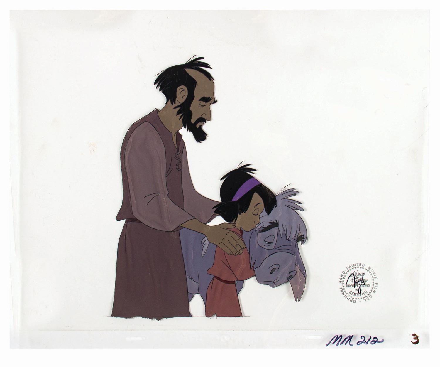 (Disney, 1978) An original production cel from the animated featurette, The Small One. The film debuted theatrically alongside the re-release of Pinocchio, and this cel wonderfully depicts the central cast of the Boy, Small One, and Father. Measuring 12.25"x16", the cel is in good condition with minor surface wear. Like many cels from this era that were offered by Disney, this cel has been laminated and has some small bubbles and a slight waviness throughout from the laminate. The Disney seal is in the lower-right corner.