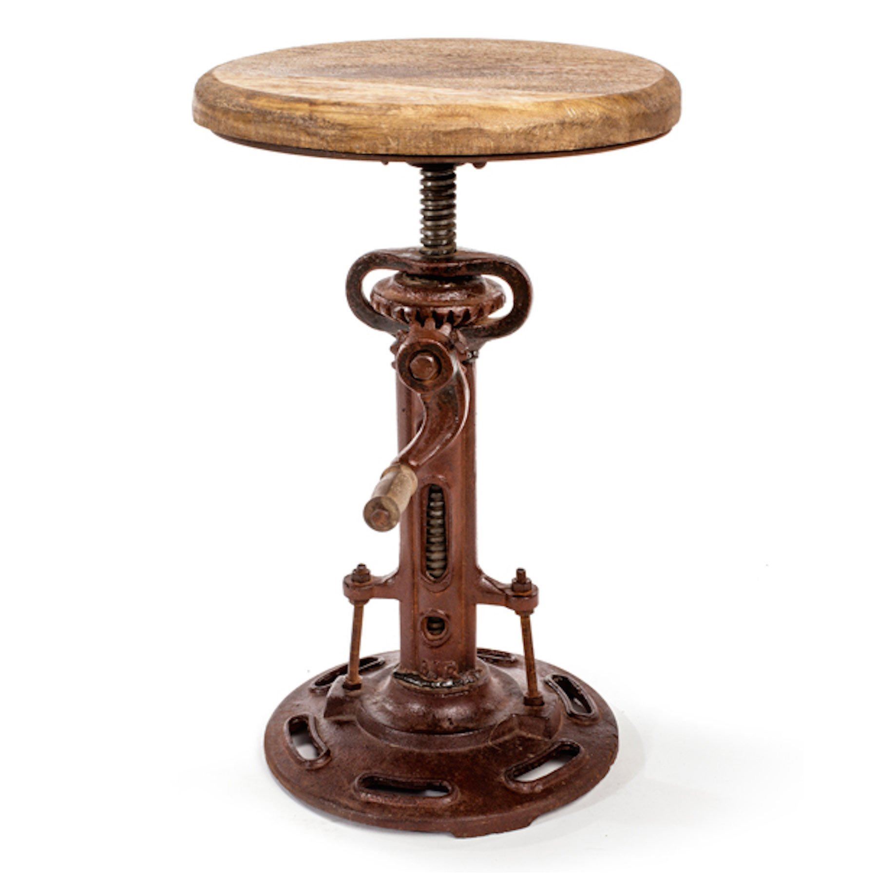 A Worn, Weathered, Round Wooden Top Styled After A Single Solid Piece Of Acacia Wood Sits Atop The Smith, And An Intricate Set Of Gears And Cogs Patterned After A Recycled Car Jack Let You Adjust The Height Up Or Down, Just Like You’d Change The Tire On Your Car.