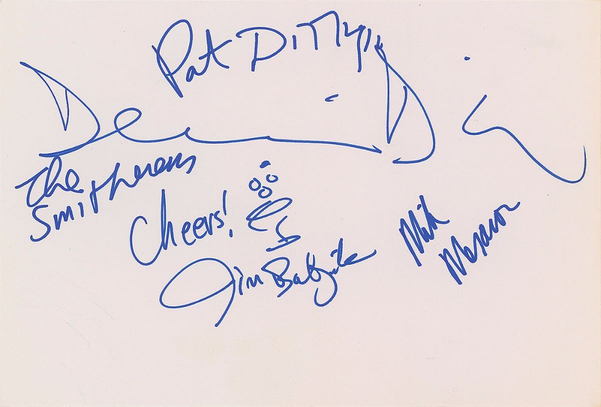 Felt tip signatures, “Dennis Diken,” “The Smithereens, Cheers! Jim Babjak,” “Pat DiNizio,” and “Mike Mesaros,” on an off-white 10.25 x 7 cardstock sheet. In fine condition.