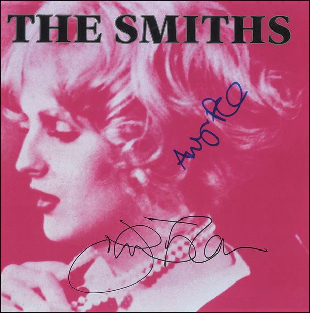 Color satin-finish 12 x 12 photo of the single, Sheila Take a Bow, signed in black and blue felt tip by Johnny Marr and Andy Rourke. In very fine condition.