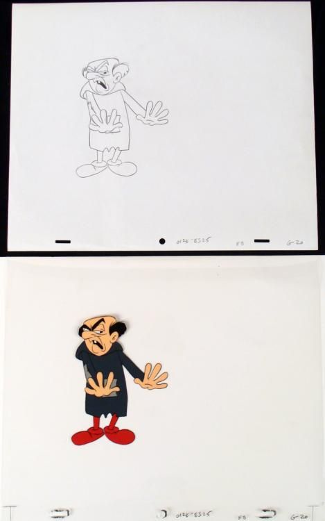 Classic Saturday-morning cartoon series featuring magical blue elf-like creatures called Smurfs. The Smurfs, named for their personalities, inhabit a village of mushroom houses in an enchanted forest. These loveable creatures are led by Papa Smurf and * live carefree... except for one major threat to their existance: Gargamel, an evil but inept wizard who lives in a stone-built house in the forest; and his feline companion, the equally nasty Azrael. Typical stories deal with the Smurfs' efforts to fight off * Gargamel, who wanted to do one of several things to the blue creatures including eat them, make them slaves and gain their magical secrets in order to gain dignity among the wizard's fraternity. More than once, the Smurfs had to save Gargamel from his back-firing * plans or even eviler wizard * * * * Leave me out it, I won't nothing to do with that... There is a matching drawing overlay of Gargamel that accompanies the cel. * * * Original Animated Cel and DrawingOriginal "rough" animation drawing, in black pencil with the notations in black pencil. * Overall size is a 12-field drawing that is 10 1/2" × 12 1/2" * Overall Size of Cel: 10 1/2" x 12 1/2" * * Excellent Condition * * * This is an original hand-painted cel set-up used in an episode of "The Smurfs." Each one-of-a-kind cel represents a slight change in position of the characters. When individually photographed and projected in rapid succession, the images appear to move. * * To create production cels, the original animator's drawing is transferred onto an acetate cel (by hand-inking and/or photo copying). The cel is then hand-painted on the reverse side. * * * * * The cel and drawing received by the winning bidder may be ever so slightly different from that in the auction photo. * * * * * The cel and drawing are ready to be matted and framed. The animator's notations are shown at the bottom of both. * *