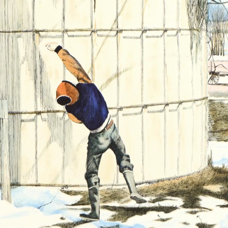 "The Snowball Thrower" is a limited edition lithograph on paper by William Nelson, numbered and hand signed by the artist! Measures approx. 22" x 28.5" (with border); 19" x 25.5" (image).
