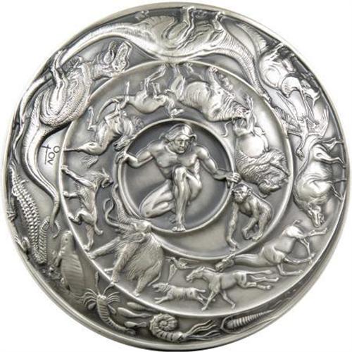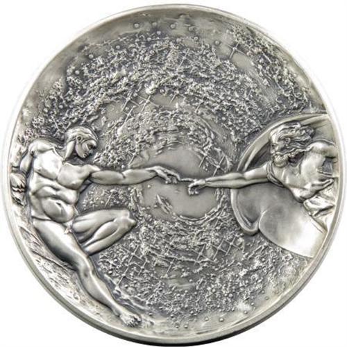 <B>The Society of Medalists 122nd Issue 1990 by Marcel Jovine.</B></I> <B>Silver,</B></I> <B>101 mm, 622 gm (20 oz). </B></I>"Creation"<B> </B></I>medal issued by the Society of Medalists as its 122nd issue, the work of Marcel Jovine, struck in .999 fine silver. The medal uses as its theme Michelangelo's<I> Creation. </B></I>The issue was limited to only 250 pieces and was struck more than 20 times. Despite the pictures, one cannot truly appreciate this piece until it is held in one's hands. Comes with the original papers and case of issue.<BR><BR><b>Shipping:</b> Coins & Currency (<a target="_blank" href="http://www.heritageauctions.com/common/shipping.php">view shipping information</a>)