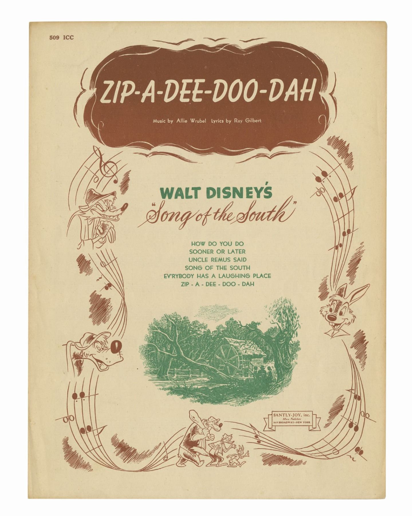 (Disney, 1946) A vintage booklet of sheet music for "Zip-A-Dee-Doo-Dah," the popular musical number from the innovative live-action and animated film, Song of the South. Published by Santly-Joy, Inc. of New York, the 2-page sheet music written by Allie Wrubel and Ray Gilbert represents arguably the most enduring element of the film, re-recorded by artists as diverse as Doris Day, The Jackson 5, and Miley Cyrus. This popular song would later play in the fan favorite Splash Mountain attraction at the Disney Parks, which is currently being re-themed based on The Princess and the Frog. Measuring 12"x9", the sheet music remains in good condition, exhibiting browning from age, most pronounced at edges, and spot soiling.