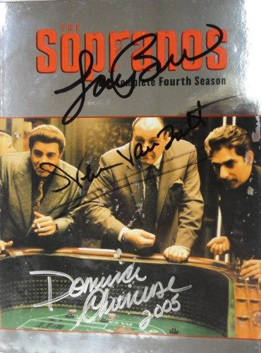 Complete DVD Set of The Sopranos 4th Season with the following Autographs. James Gandolfini, Lorraine Bracco, Edie Falco, Michael Imperioli, Dominic Chianese, Steve Van Zandt, Tony Sirico and two other unidentified. Est Value $250.00 - $300.00.