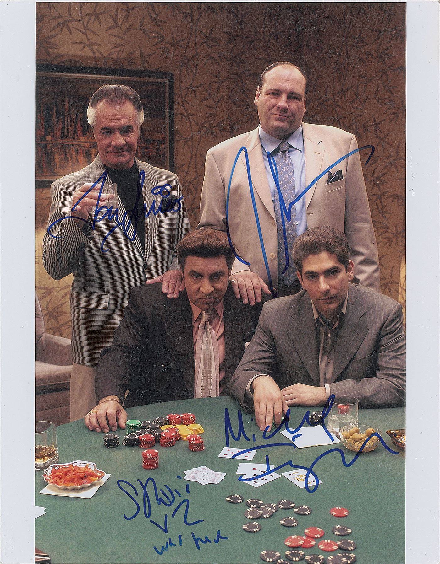 Color satin-finish 11 x 14 photo of Tony Soprano, Paul 'Paulie Walnuts' Gualtieri, Silvio Dante, and Christopher Moltisanti, signed in blue felt tip by James Gandolfini, Tony Sirico, Steven Van Zandt, and Michael Imperioli. In fine condition, with scattered creasing and mild corner tip dings. Originally obtained by in-person specialist Mike Wehrmann.