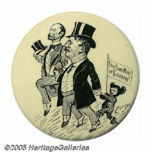 <B>The Sought-after 1904 Theodore Roosevelt and Charles Fairbanks Cartoon Jugate by the Creator of the Teddy Bear</B></I> Clifford Berryman was one of the most talented political cartoonists of the day, but he is best remembered as the originator of the Teddy Bear as a symbol of TR. This unique 1 3/4" button pictures Teddy and his Vice Presidential runningmate in lock-step, while a little Teddy Bear with a flag declaring "Four Years More of Theodore" trails behind! The cartoon design is signed "Berryman" at 4:00. The present example is in unimprovable, pristine condition. Even the button paper on the back is mint. One of the most popular of all celluloid button rarities! Lot:261