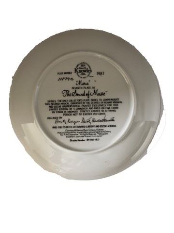 The Sound Of Music (1949)- "Maria" 7th plate in this collector's plate series to commemorate this beloved musical. Endorsed by the estates of Richard Rodgers and Oscar Hammerstein II. Painted exclusively for this Limited Edition by T. Crnkovich and fired on fine China by Edwin M. Knowles. Plate number 11879 e (10"x10"). Certificate of Authenticity included.
