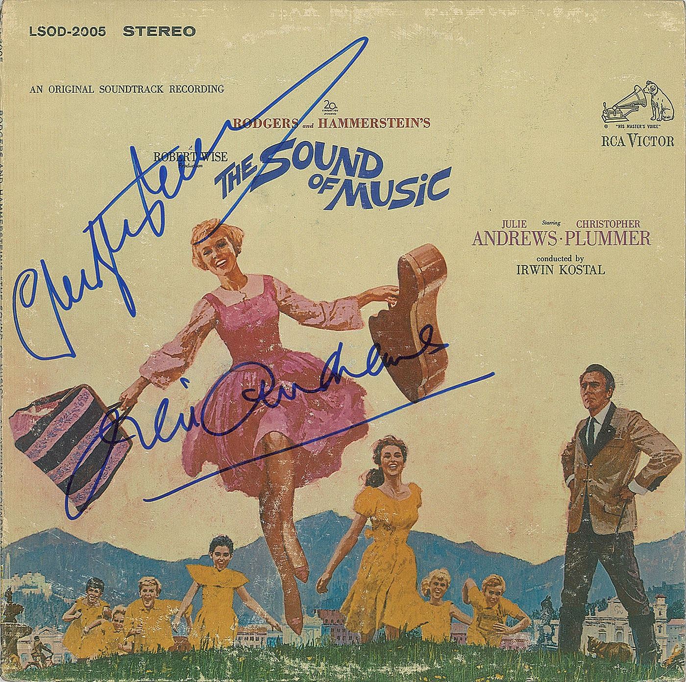 The Sound of Music soundtrack album signed on the front cover in blue felt tip by Julie Andrews and Christopher Plummer. In fine condition, with light scuffing. The record is not included.