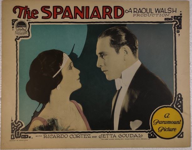 The Spaniard (Paramount Pictures, 1925) lobby card. Drama. Starring Ricardo Cortez, Jetta Goudal, Noah Beery, Mathilde Brundage, Renzo De Gardi, Emily Fitzroy, Bernard Siegel, Florence Regnart. Directed by Raoul Walsh. Minor edge wear, minor creases, pin-holes. Excellent. (11"x14").