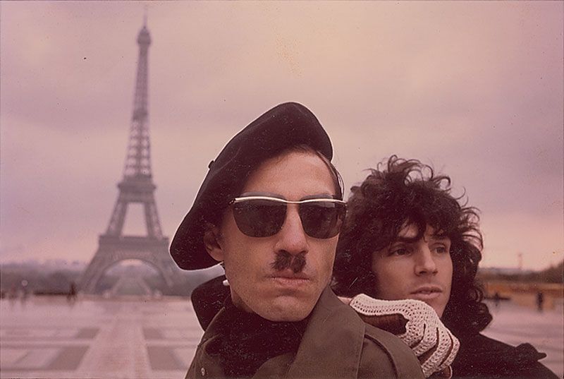 Color glossy 9.5 x 6.5 photo of Ron and Russel Mael posing outdoors near the Eiffel Tower, with Ron sporting an unconventional Chaplin-like moustache. In fine condition. In fine condition. Provenance: Richard Creamer Estate. Creamer was a famous Rolling Stone photographer very active and well known in the 1970s Los Angeles Rock scene. The collection of Creamer photos offered in this auction were kept in his personal collection and several appeared in magazines.