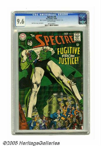 <B>The Spectre #5 (DC, 1968) CGC NM+ 9.6 Off-white pages.</B></I> The Spectre was one fearsome fellow, and with apologies to his Golden Age portrayer Bernard Baily, no one ever drew a more imposing Spectre than Neal Adams did for this cover right here! Adams drew the rest of the issue as well, and he's even credited with writing the script. There's also an appearance by the Psycho-Pirate. CGC notes, "From the Dallas Stephens collection." Overstreet 2005 NM- 9.2 value = $120. CGC census 6/05: 4 in 9.6, none higher.