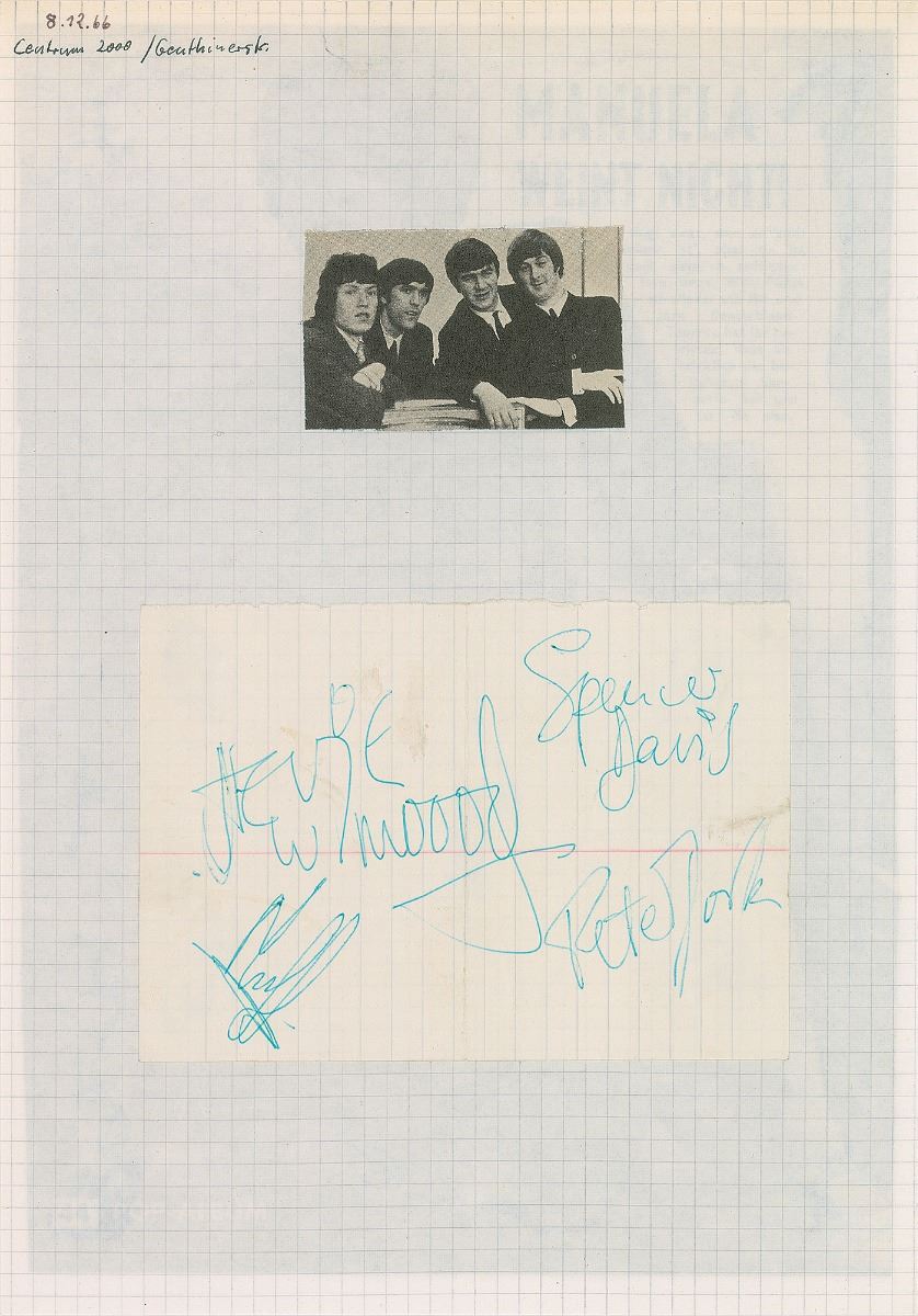 Vintage ballpoint signatures of Spencer Davis, Pete York, Steve Winwood, and Muff Winwood on an off-white 5.75 x 4 lightly-lined sheet affixed to a larger gridded sheet bearing affixed band clippings on the front and back. In fine condition, with intersecting folds. Collector’s ink notations in upper left corners indicate that the signatures were obtained in Germany on December 8, 1966.