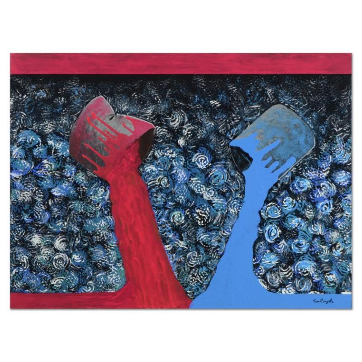 "The Spill" is an original mixed media on canvas by Tom Pergola, hand signed by the artist. This piece cones gallery wrapped. Includes Certificate of Authenticity. Measures approx. 40" x 30" (image).