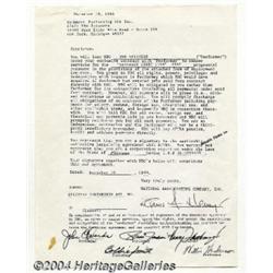 <B>The Spinners - Signed Contract (1981).</B></I> A one-page, 8.5" x 11" agreement, dated 12/10/81 for The Spinners to appear on "Saturday Night Live." In fine condition, boldly signed by all five members of the band (John Edwards, Pervis Jackson, Henry Fambrough, Bobbie Smith and William Henderson) in black ink. <I>Accompanied by COA from PSA/DNA. </B></I> <BR><BR><B>Important notice:</B> Heritage usually auctions material at the rate of 200-250 lots per hour. On some occasions eBay Live bid software or the Internet may not be able to keep up with the pace of the auction. We recommend placing a realistic absentee bid now as insurance to avoid disappointment. Occasionally the auctioneer may eliminate or reject an eBay Live bid, and the auctioneer may also reopen a lot after the close of the eBay live bidding (usually because we missed an audience bid), and may reject your bid even if it shows you as the winning bidder. By bidding via eBay Live, you agree that Heritage may award the lot to another bidder at its sole discretion under the circumstances described above or any other reasonable circumstances. Since eBay bids are not shown to us until we open the lot on the floor, we treat those bids just like floor bids. In most cases the floor responds before the eBay bid is presented to us, due to Internet lag time, so for consistency we have made it a policy that floor bids are always considered first over tie eBay live bids. Also please note that all Heritage lots purchased through eBay Live carry a 24.5% Buyer's Premium. Please make sure you read the Terms and Conditions before you bid.