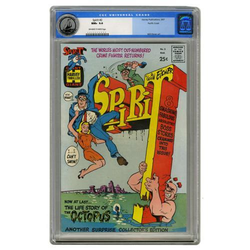 <B>The Spirit #2 Pacific Coast pedigree (Harvey, 1967) CGC NM+ 9.6 Off-white to white pages.</B></I> Square bound. Will Eisner art (new stories and reprints). Overstreet 2006 NM- 9.2 value = $80. CGC census 6/06: 4 in 9.6, none higher. <BR><BR><B>Important notice:</B> Heritage usually auctions material at the rate of 200-250 lots per hour. On some occasions eBay Live bid software or the Internet may not be able to keep up with the pace of the auction. We recommend placing a realistic absentee bid now as insurance to avoid disappointment. Occasionally the auctioneer may eliminate or reject an eBay Live bid, and the auctioneer may also reopen a lot after the close of the eBay live bidding (usually because we missed an audience bid), and may reject your bid even if it shows you as the winning bidder. By bidding via eBay Live, you agree that Heritage may award the lot to another bidder at its sole discretion under the circumstances described above or any other reasonable circumstances. Since eBay bids are not shown to us until we open the lot on the floor, we treat those bids just like floor bids. In most cases the floor responds before the eBay bid is presented to us, due to Internet lag time, so for consistency we have made it a policy that floor bids are always considered first over tie eBay live bids. Also please note that all Heritage lots purchased through eBay Live carry a 22.5% Buyer's Premium. Please make sure you read the Terms and Conditions before you bid. This lot is being auctioned in conjunction with a live floor auction by Heritage Auction Galleries. All final auction and invoice information will be supplied by Heritage Auction Galleries, and all other information should be considered preliminary. Lot:41001 <BR><BR><B>Winning Notification and Billing:</B> After the FINAL session in this auction is complete, Heritage will send e-mail and snail mail invoices. This process normally takes several days. All final auction and invoice information will be supplied by Heritage Auction Galleries, and all other information should be considered preliminary. <BR><BR>This auction will be conducted on a live auction floor and over the Internet through eBay Live. If you choose to place an absentee bid, please take a moment to <font color='#0000ff'><u><a href='http://pages.ebay.com/liveauctions/help/before/laabsentee.html'>learn how eBay Live absentee bidding works</a></u></font><font color='#000000'>