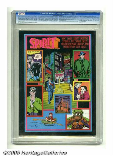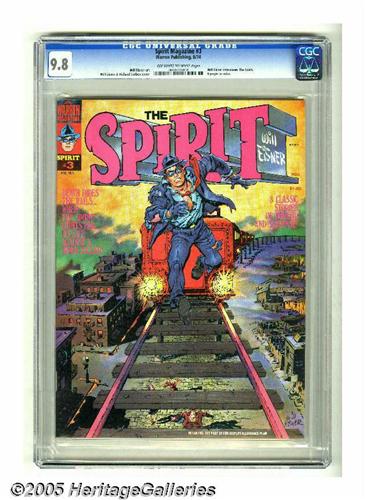 <B>The Spirit #3 (Warren, 1974) CGC NM/MT 9.8 Off-white to white pages.</B></I> Will Eisner cover, colored by Richard Corben. Eisner art. 8 pages are in color. Overstreet 2005 NM- 9.2 value = $22. CGC census 3/05: 1 in 9.8, none higher. <I>From the collection of Chris Bell.</B></I>