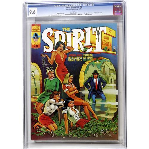 <B>The Spirit #8 (Warren, 1975) CGC NM+ 9.6 White pages.</B></I> Contains the Spirit's Women Club text. Will Eisner and Ken Kelly cover art. Eisner interior art. Overstreet 2006 NM- 9.2 value = $20. CGC census 2/07: 1 in 9.6, 1 higher.<BR><BR><b>Shipping:</b> Comics - Slabbed (certified) (<a target="_blank" href="http://www.heritageauctions.com/common/shipping.php">view shipping information</a>)