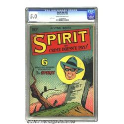 The Spirit #nn (#2) (Quality, 1945) CGC VG/FN 5.0 Cream to off white pages. Will Eisner created one of the best crime-fighting heroes in the comics with this character, whose only costume was a suit, slouch hat, and domino mask! Here's the Spirit, in the second newsstand issue to feature his adventures. Lou Fine drew the moody cover to this issue. Overstreet 2003 VG 4.0 value = $86; FN 6.0 value = $129. Important notice: Heritage usually auctions material at the rate of 200-250 lots per hour. On some occasions eBay Live bid software or the Internet may not be able to keep up with the pace of the auction. We recommend placing a realistic absentee bid now as insurance to avoid disappointment. Occasionally the auctioneer may eliminate or reject an eBay Live bid, and the auctioneer may also reopen a lot after the close of the eBay live bidding (usually because we missed an audience bid), and may reject your bid even if it shows you as the winning bidder. By bidding via eBay Live, you agree that Heritage may award the lot to another bidder at its sole discretion under the circumstances described above or any other reasonable circumstances. Since eBay bids are not shown to us until we open the lot on the floor, we treat those bids just like floor bids. In most cases the floor responds before the eBay bid is presented to us, due to Internet lag time, so for consistency we have made it a policy that floor bids are always considered first over tie eBay live bids. Also please note that all Heritage lots purchased through eBay Live carry a 20% Buyer's Premium. Please make sure you read the Terms and Conditions before you bid.