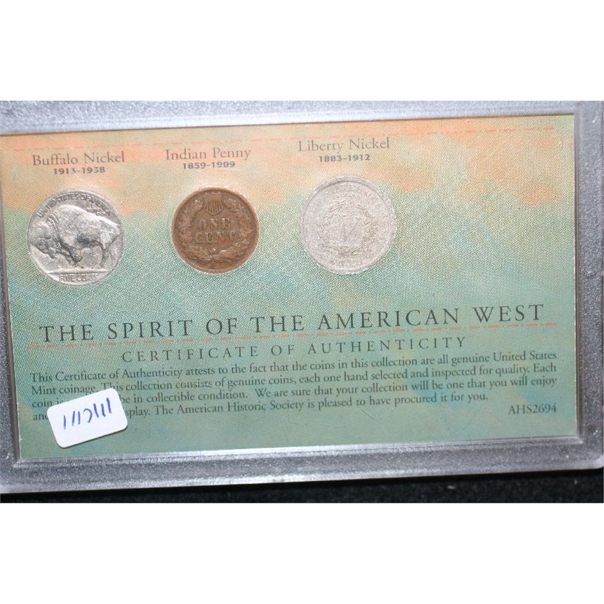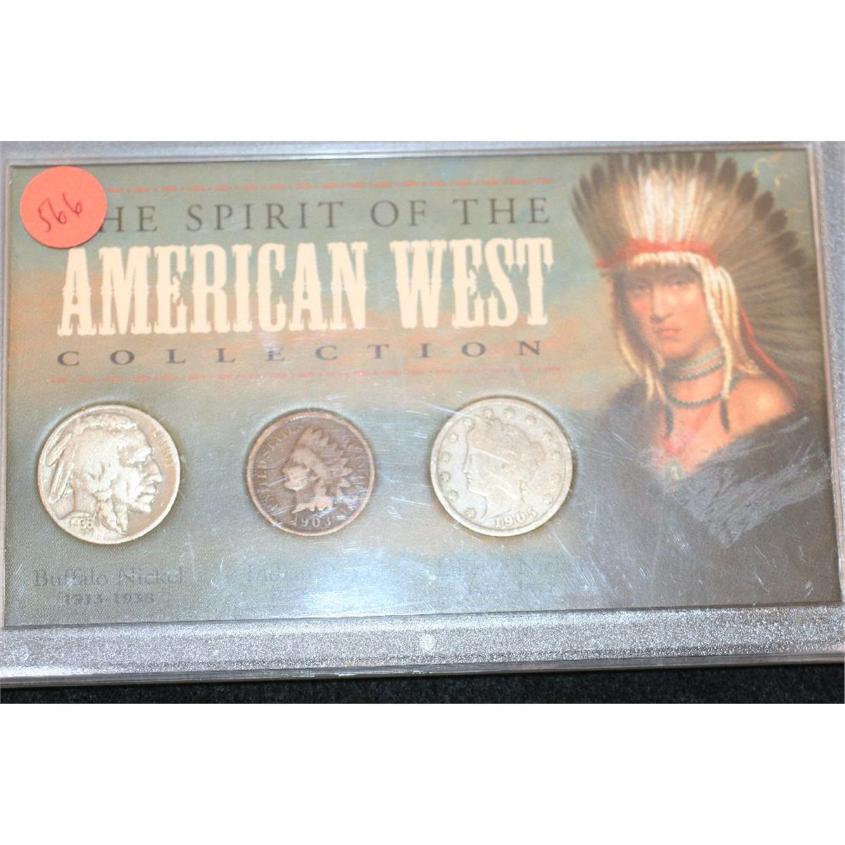 The Spirit of The American West Coin Collection to include 1936 Buffalo Nickel, 1903 Indian Head Penny & 1905 V-Nickel