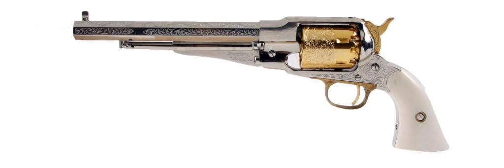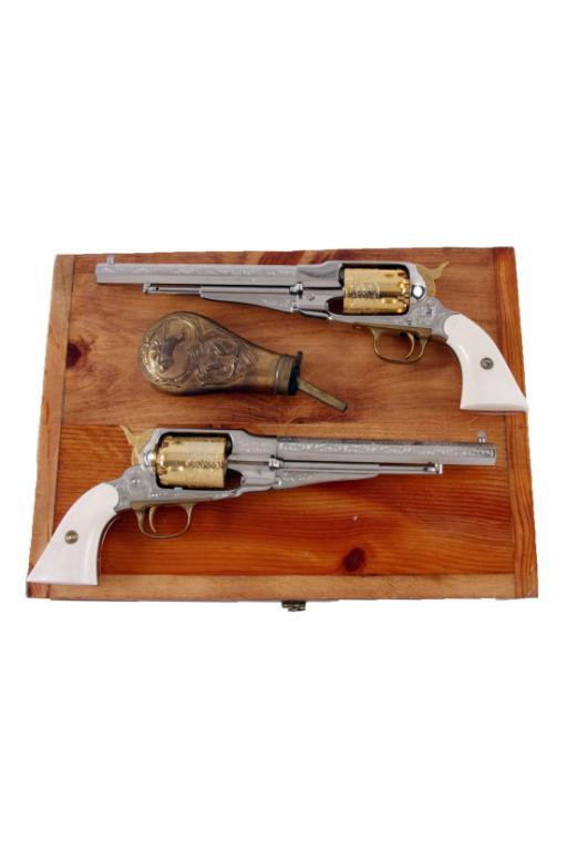 The Sportsman's Guide Repro '58 Remington Cal .44, SN:SG0274/SG1874, An excellent pair of Limited Edition reproduction Remington 1858 Army percussion revolvers made in Italy by F.LLI Pietta for the Sportsman's Guide. "1 of 5000" richly nickel plated and beautifully engraved with the cylinder, hammer, trigger and trigger housing plated in 24 Karat gold. Unfired in pine display box with brass powder horn