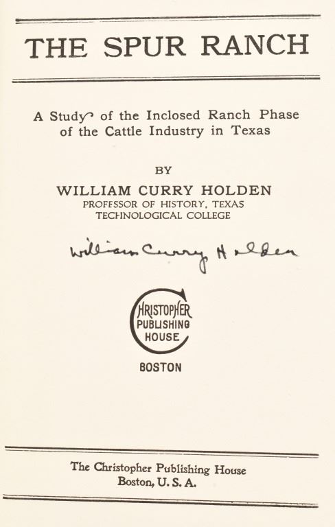 A Study of the Inclosed Ranch Phase of the Cattle Industry in Texas. Signed by author. Published by Christopher Publishing House Boston Copyright 1934
