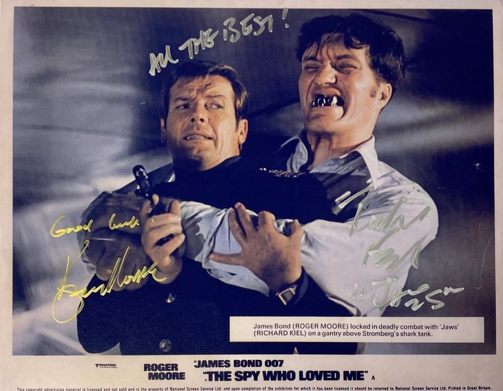 The Spy Who Loved Me Roger Moore and Richard Kiel facsimile signed movie photo. 8x10 inches. This item is a reprint of an original autograph