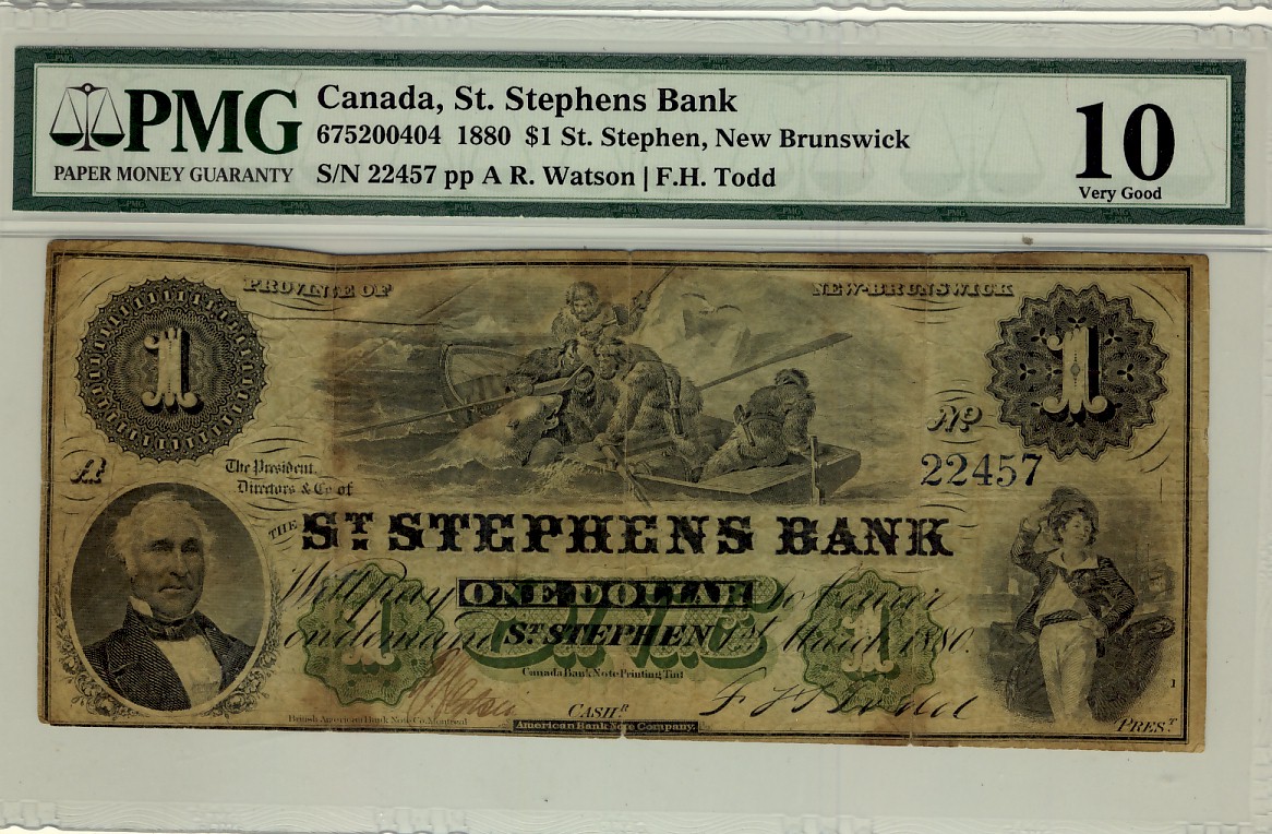 The St, Stephens Bank 1880 $1 22457 CH-675-20-04-04 PMG VG10. Only 7 pieces known. Rare.