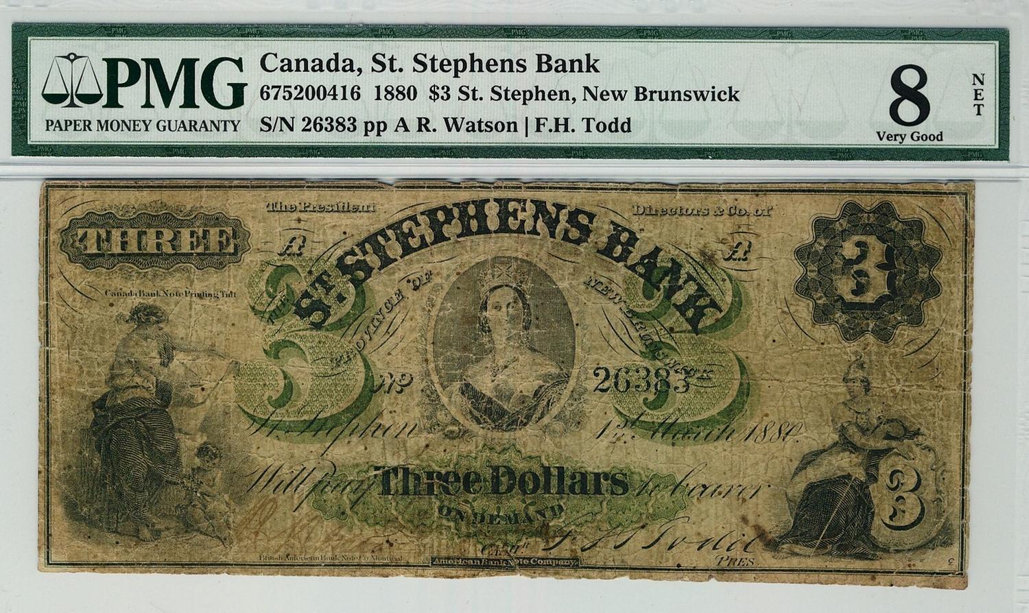 The St, Stephens Bank 1880 $3 26383 CH-675-20-04-16 PMG VG8. Only 6 examples known.