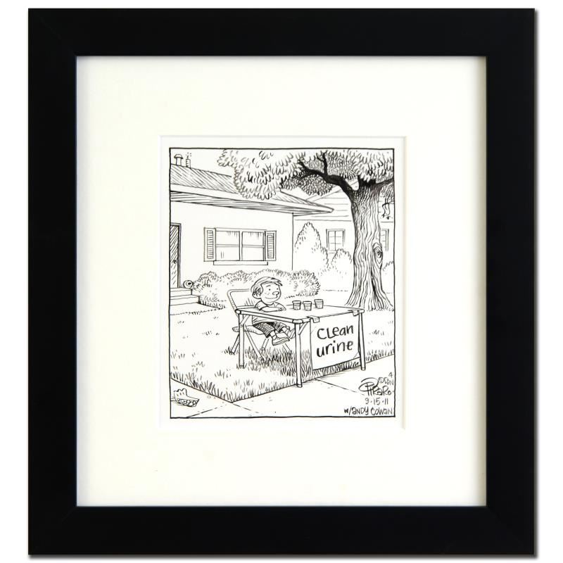 Enter a surreal and satirical world of twisted imagination and award winning creativity. "The Stand" is an original pen & ink drawing on paper by Dan Piraro, creator of the critically acclaimed and award winning comic strip, Bizarro! This piece is hand signed and comes framed. Includes Certificate of Authenticity! Measures approx. 13" x 14" (frame), 6" x 7" (image).