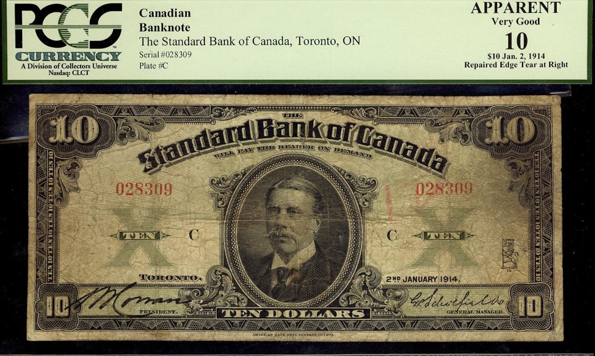 The Standard Bank of Canada 1914 $10 #028309 CH-695-18-14, PMG VG10. Scarce signature issue. Unlisted in fine or above grades. Note has a repaired edge tear.