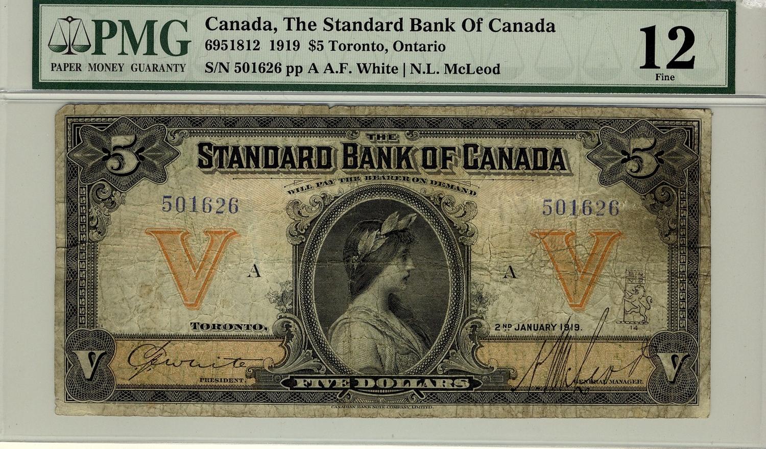 The Standard Bank of Canada, 1919 $5 #501626, CH-695-18-12, PMG F12.
