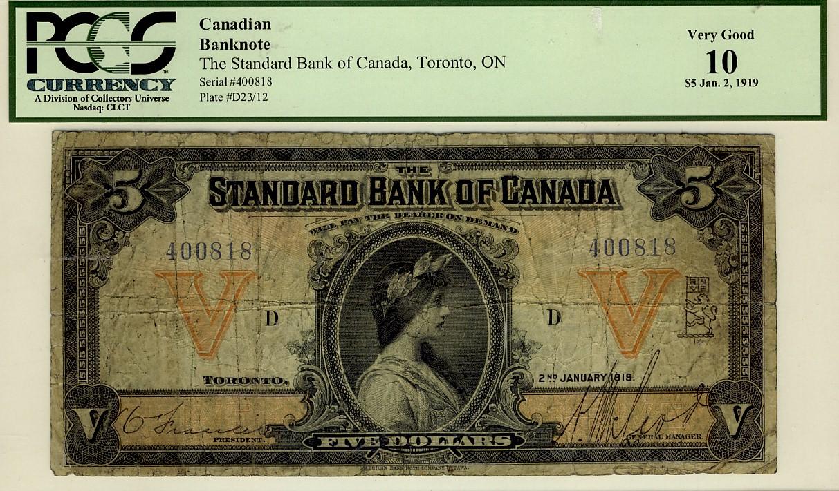 The Standard Bank of Canada 1919 $5 CH-695-18-10 #400818, PCGS VG10.