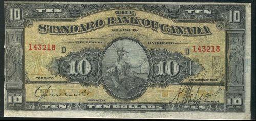 The Standard Bank of Canada 1924 $10 CH-695-20-04 F+, light tear, scarce!