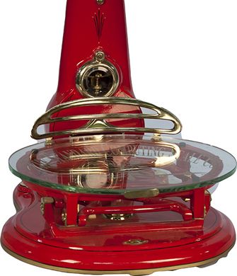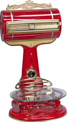 The Standard Computing Scale Co. Barrel Scale w/ fancy etched glass tray, red, gold & brass, restored