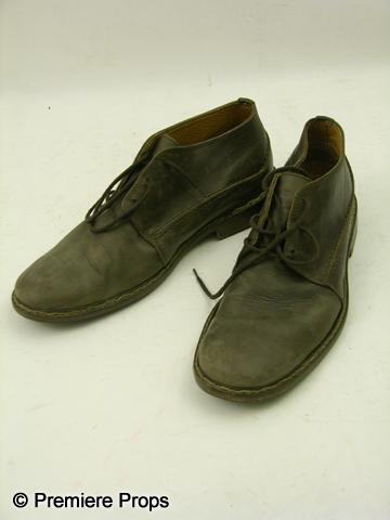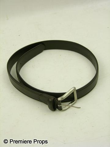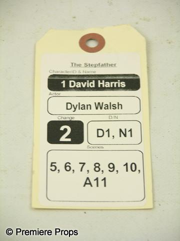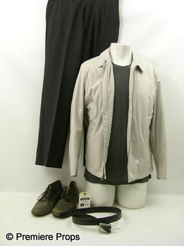 The Stepfather - Daddy's home. From the set, this is David Harris' (Dylan Walsh) screen worn gray short sleeve crew neck "Calvin Klein" t-shirt (size M), tan zip up with collar and front zipper pockets "Banana Republic" rain jacket (Size M), black four pocket button zipper and clasp fly "John Varvatos" dress pants (Size 32x32), black leather with square brass buckle "Cole Haan" belt (size 34), and brown leather lace up with leather and rubber soles "John Varvatos" shoes. (size 9.5) Includes wardrobe tag! (STEP1023)