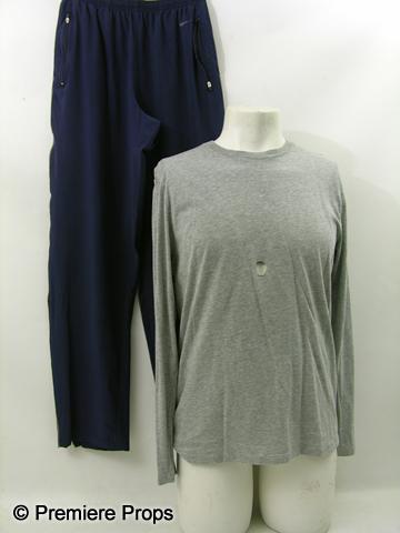 The Stepfather - Daddy's home. From the set, this is David Harris (Dylan Walsh) screen worn gray long sleeve crew neck "Banana Republic" shirt, (size M) and navy blue with zipper pockets elastic waistband with drawstrings "Nike" pants. (Size m) There is a hole in the front of the shirt. (STEP1081)