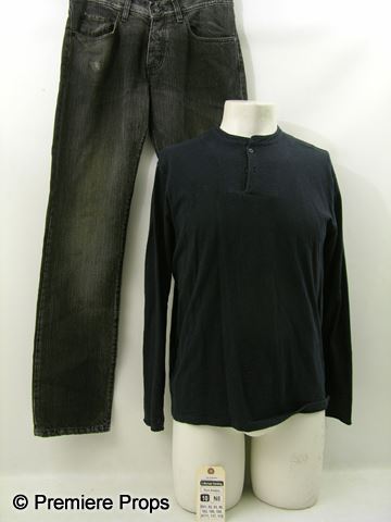 Michael Harding's (Penn Badgley) screen worn dark blue long sleeve with two buttons at collar "French Connection" shirt, (Size L) and black denim button fly five pocket "Nobody" jeans. (Size 31x33) Includes wardrobe tag!